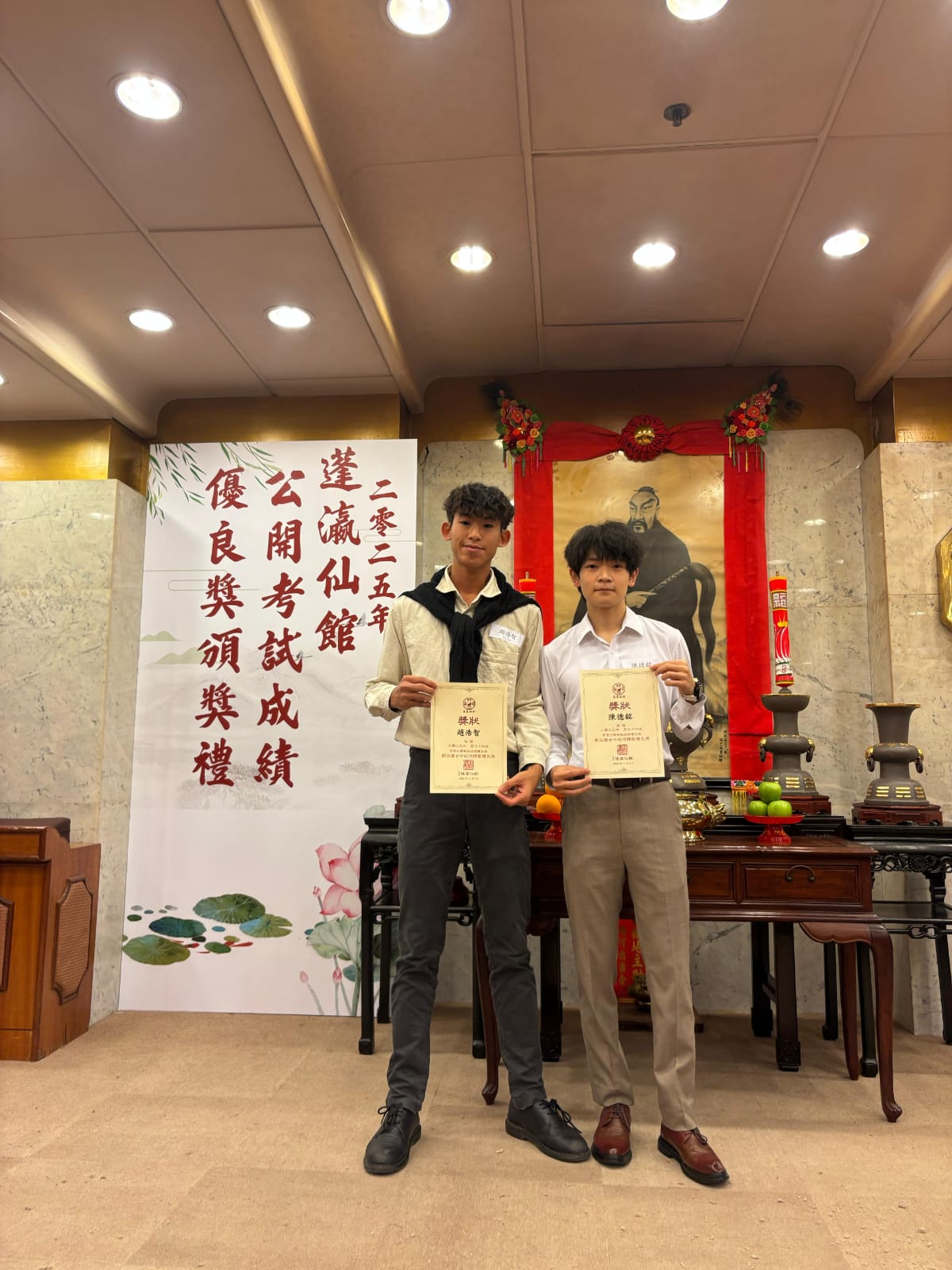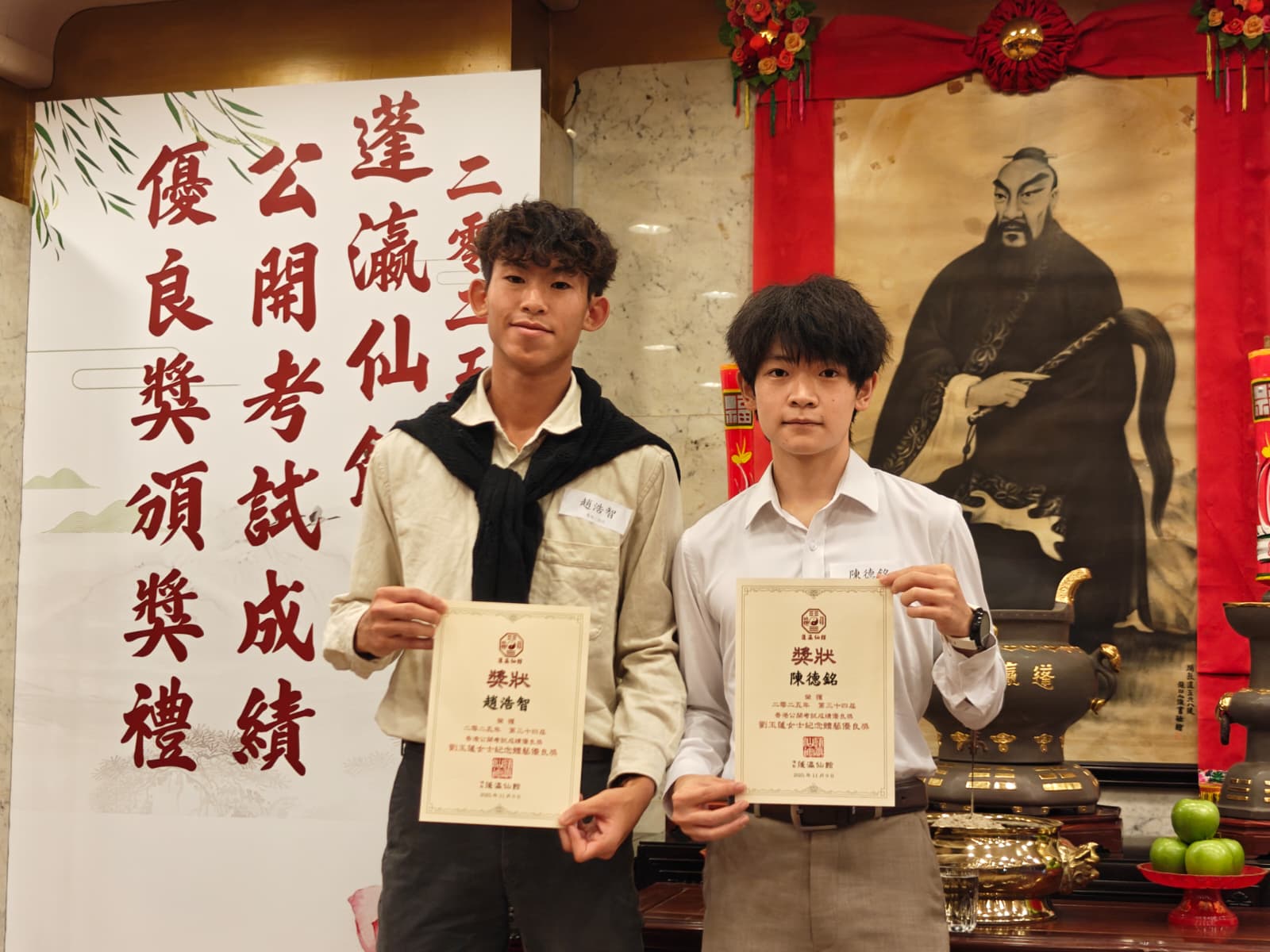 本校2025年畢業生陳德銘(城大)及趙浩智(城大)獲頒蓬瀛仙館「香港公開試成績優良獎-劉玉蓮女士紀念體藝優良獎」,頒獎典禮於2025年11月9日在蓬瀛仙館舉行。