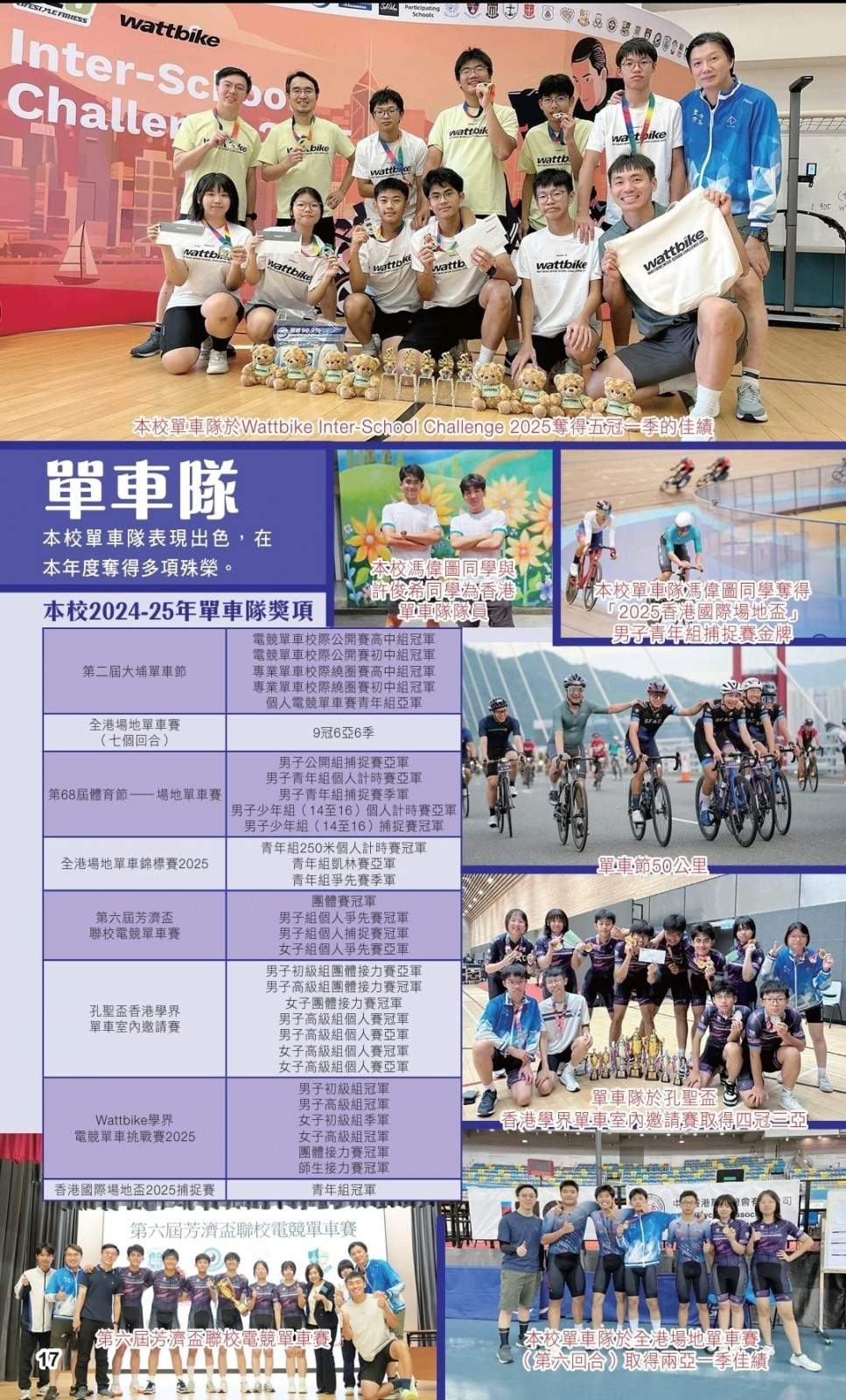 近年的電競單車比賽、不論地區性的大埔單車節、北區運動巡禮室內單車比賽、或全港性的ICG Indoor Cycling School Challenge、Wattbike學界電競單車挑戰賽,我校均全數奪冠。