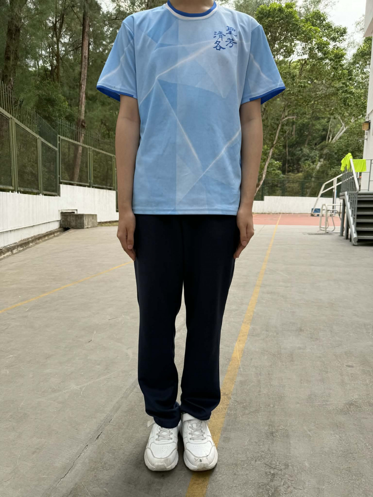 男生: - 白色棉質的確涼短袖裇衫,左袋有校徽 - 藍色棉斜長西褲 |