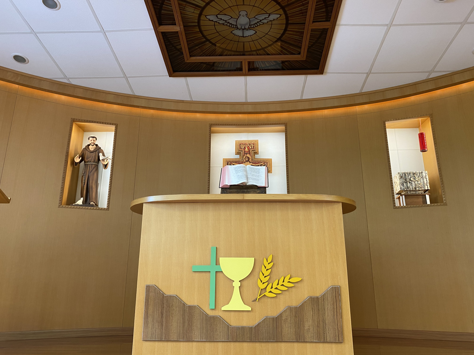 設計特色: 祭台中央的十字架採用聖達勉堂十字架 (又名聖方濟各十字架) ;左方設有聖方濟各像,聖像原設於校務處,1995年時,為尋找合適的聖像,前校長儲富有先生委託麥建良老師親自由意大利亞西西攜帶聖像回港;右方設有聖體櫃,以便朝拜聖體時存放聖體。祭台圖像是十字架、聖血杯及麥穗,象徵基督犧牲自己,奉獻體血,救贖世人。祭台天花燈彩繪玻璃以白鴿形象組成,象徵聖神降臨。祈禱室亦設有十四處苦路掛畫,供苦路善功之用。